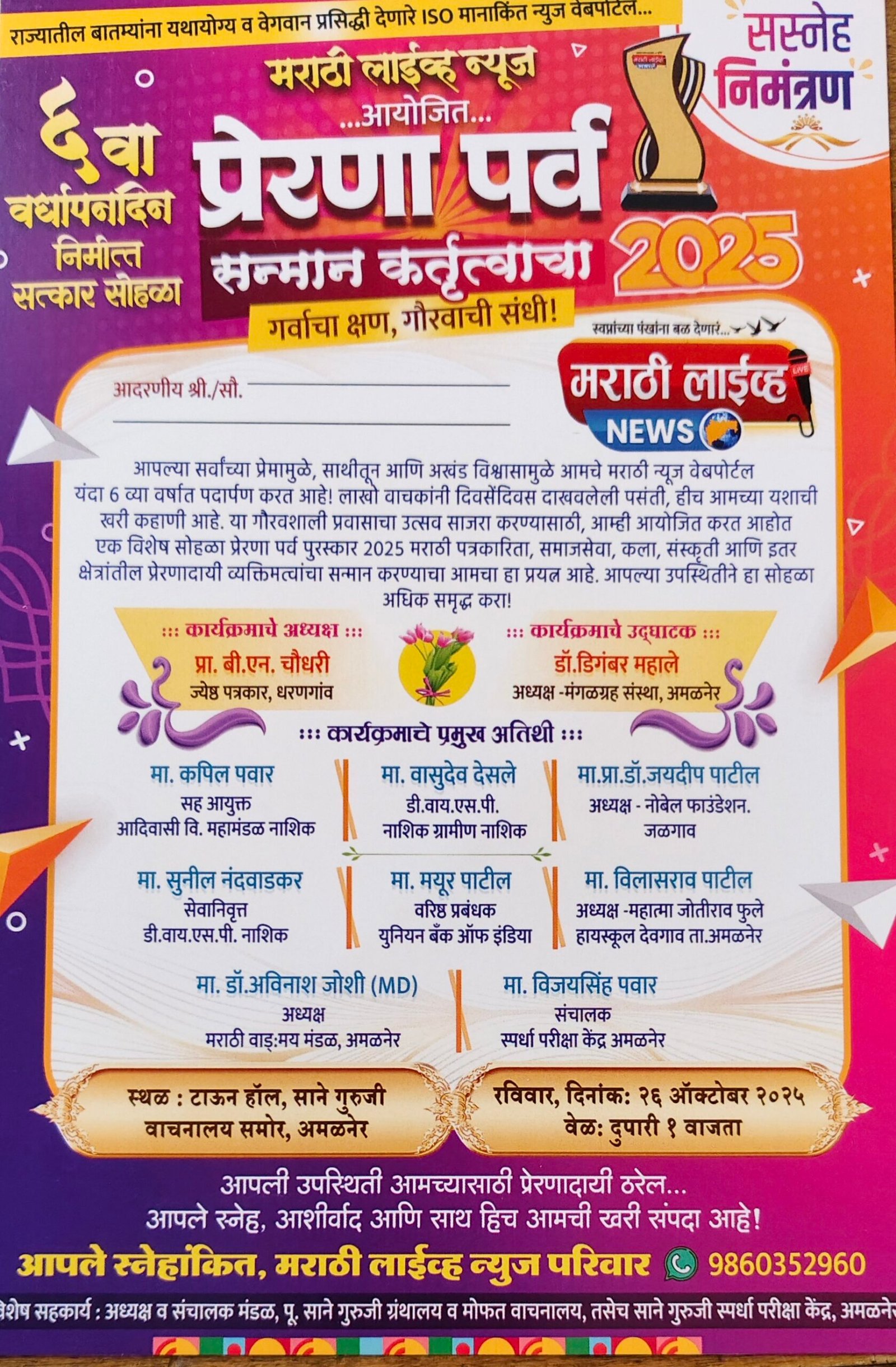 राज्यातील घडामोडींना यथायोग्य, अचूक व वेगवान प्रसिद्धी देणाऱ्या ISO मान्यताप्राप्त मराठी वेबपोर्टल “मराठी लाईव्ह न्यूज” या प्रतिष्ठित माध्यम संस्थेचा सहावा वर्धापन दिन व “सन्मान कर्तृत्वाचा 2025 – प्रेरणा पर्व” हा विशेष सन्मान सोहळा दि. 26 ऑक्टोबर 2025 रोजी दुपारी 1 वाजता अमळनेर येथील जुना टाऊन हॉल, साने गुरुजी वाचनालय समोर मोठ्या उत्साहात पार पडणार आहे.
