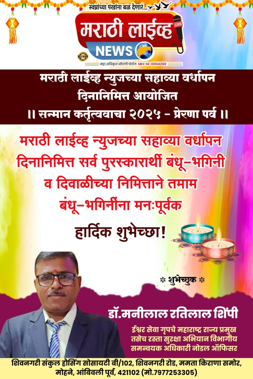 सामाजिक बांधिलकी जोपासणारे नेतृत्व : कर्तृत्व आणि दातृत्वाचा संगम – डॉ. मनिलाल रतिलाल शिंपी मराठी लाईव्ह न्युजच्या सहाव्या वर्धापन दिनानिमित्त आयोजित “सन्मान कर्तृत्वाचा 2025” या सोहळ्यात पुरस्कार’ प्रदान