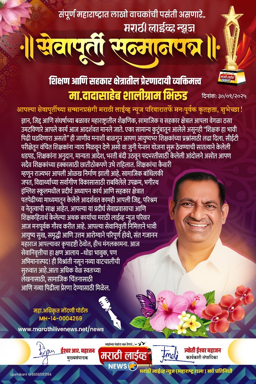 शिक्षक संघटनेचे निष्ठावान नेते दादासाहेब भिरूड यांचा गौरव — मराठी लाईव्ह न्यूजतर्फे शाल-बुके व सन्मानपत्र प्रदान