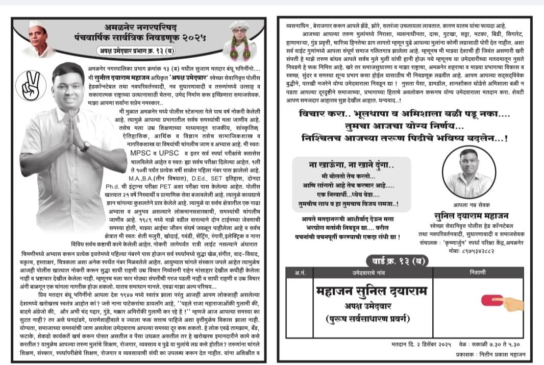 अमळनेर प्रतिनिधी – प्रभाग क्रमांक 13 ब मध्ये निवडणूक रंगतदार होत असताना, अपक्ष उमेदवार सुनिल दयाराम महाजन यांच्या पारदर्शक आणि जनहितवादी प्रतिज्ञापत्राची जोरदार चर्चा सुरू आहे. जनतेपुढे 500 रुपयांच्या स्टॅम्प पेपरवर लिहिलेल्या आश्वासनांनी मतदारांमध्ये विश्वासाची नवी उमेद निर्माण केली आहे.