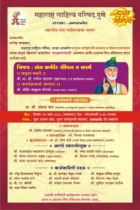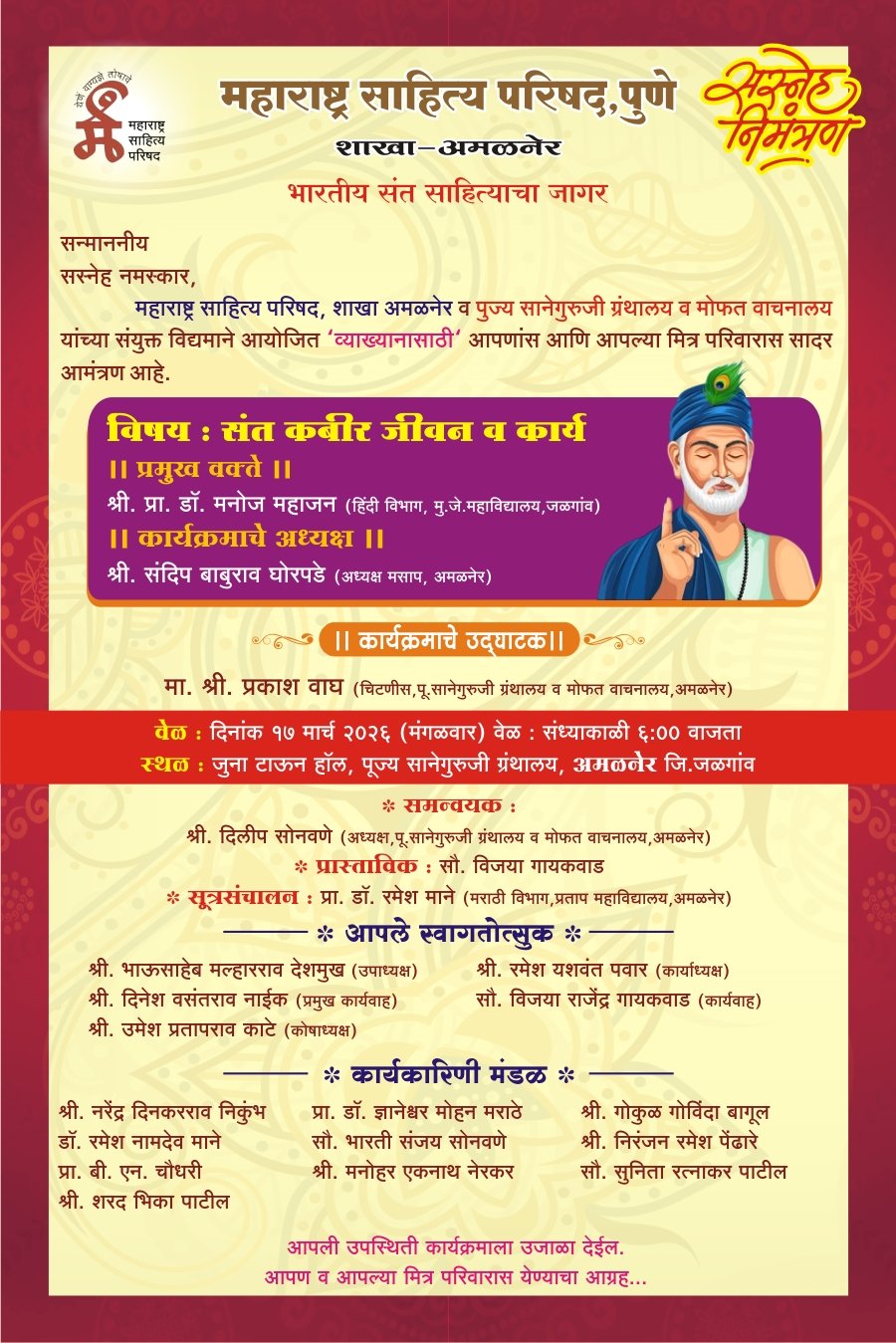 महाराष्ट्र साहित्य परिषद, पुणे शाखा अमळनेर व पूज्य सानेगुरुजी ग्रंथालय व मोफत वाचनालय, अमळनेर यांच्या संयुक्त विद्यमाने “भारतीय संत साहित्याचा जागर” या उपक्रमांतर्गत “संत कबीर : जीवन व कार्य” या विषयावर विशेष व्याख्यानाचे आयोजन करण्यात आले आहे.